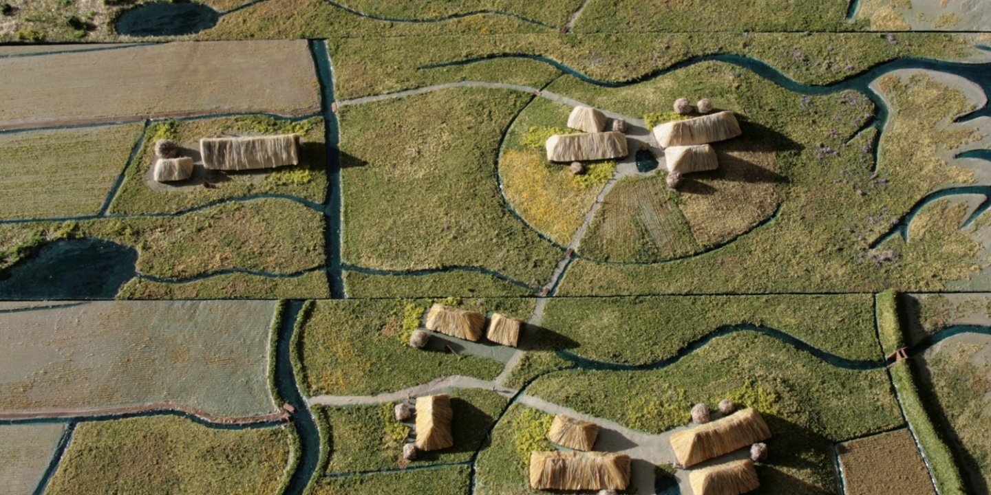 Voor dit project werden drie smalle, langwerpige maquettes gerealiseerd in schaal 1:500. De serie toont een fictieve locatie in Oostelijk Fivelgo op drie verschillende momenten in de tijd.